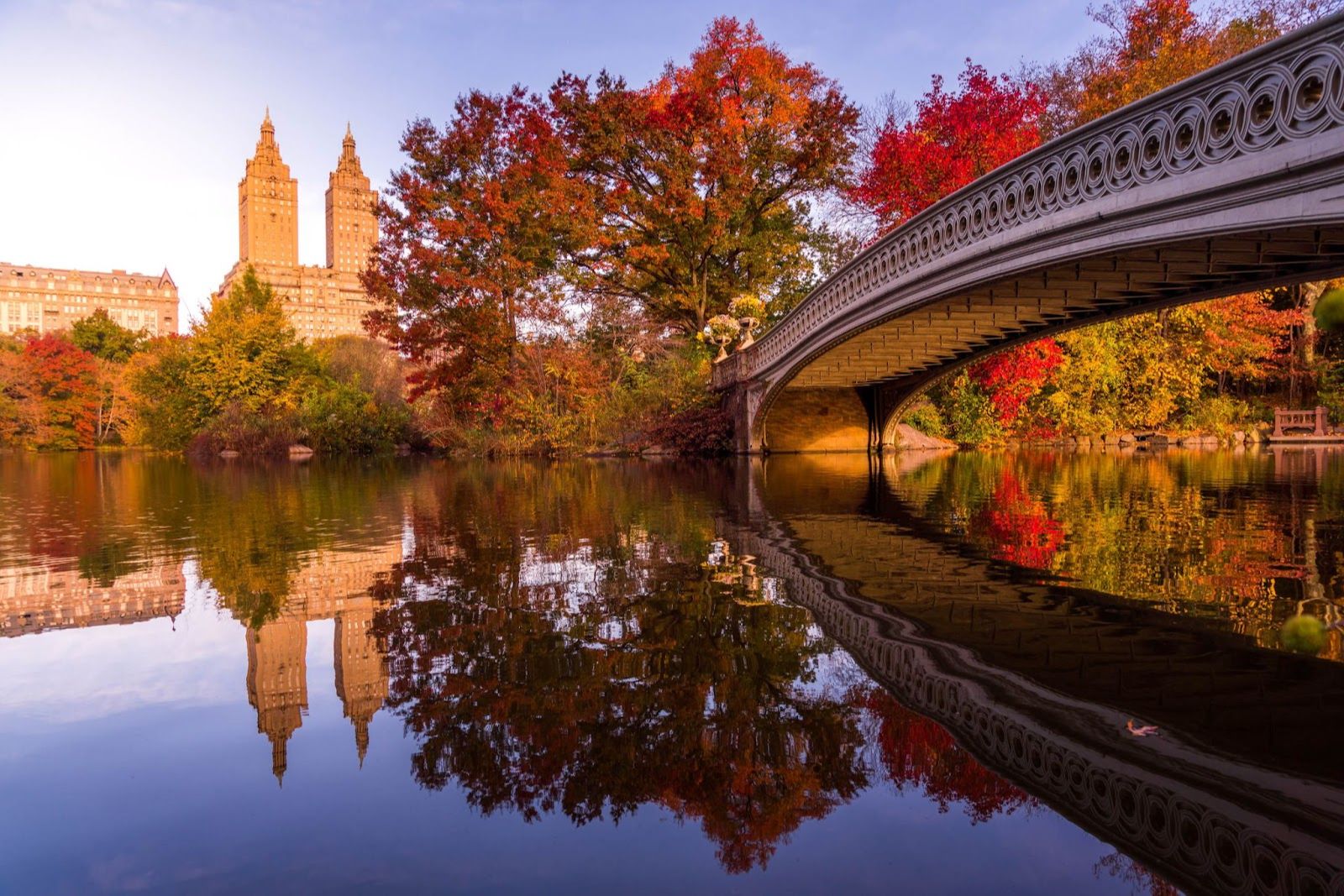 Sunset in with the Autumn colors in Central Park, The Bow Bridge and the Upper West Side.